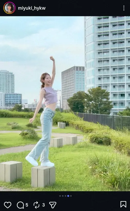 この投稿にフォロワーらからは「感謝 元気でました」「めっちゃ可愛い」「スタイル抜群。毎日素敵なみゆきさんですね」「可愛すぎるよ~」「笑顔が素敵だね」「デニムコーデお似合いで笑顔も素敵で可愛い」「デニム姿たまりません」などの声が寄せられている。