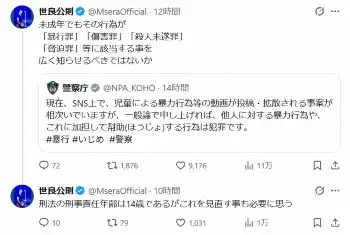 警察庁は22日に公式X(旧ツイッター)で「現在、SNS上で、児童による暴力行為等の動画が投稿・拡散される事案が相次いでいますが、一般論で申し上げれば、他人に対する暴力行為や、これに加担して幇助(ほうじょ)する行為は犯罪です」とポストした。