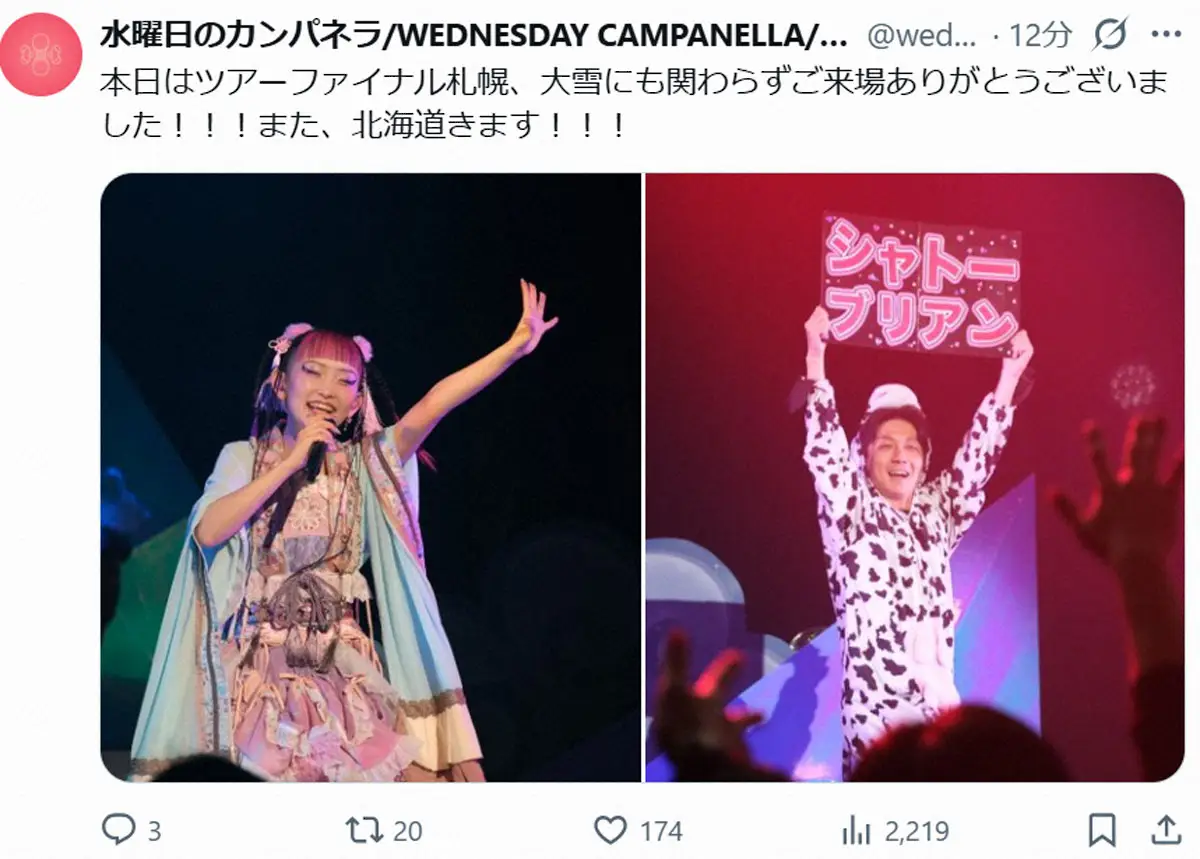 同日、公式サイトで北海道のZepp Sapporoで開催予定の「水曜日のカンパネラ ZEPP TOUR 2025/2026 ~可愛女子~・札幌」について、開催することを発表。「メンバー/スタッフが会場へ到着するのが遅くなっており、誠に大変恐縮ですが、開場/開演時間を変更させて頂きます」とし、本来午後5時開場、開演6時のところ、会場午後7時、開演午後7時30分、終演予定を午後9時とすることも合わせた発表された。しかし、午後8時2分に更新された公式Xでは「開演遅れておりますが、間も無くです。悪天候の中ご来場誠にありがとうございます」と開演が大幅に遅れていることが伝えられていた。