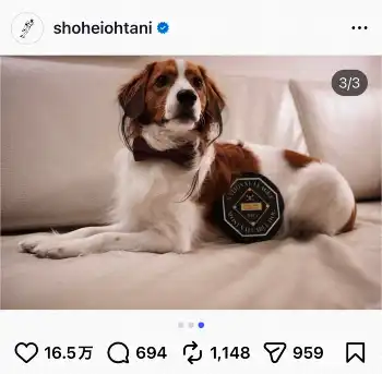 大谷翔平のインスタグラム(@shoheiohtani)から 大谷翔平の愛犬デコピンがBBWAAの最優秀犬賞受賞 盾も贈呈 粋な表彰に大… ギャラリーで見る この記事のフォト 2026年01月26日の画像一覧 もっと見る 2026年01月26日の画像をもっと見る