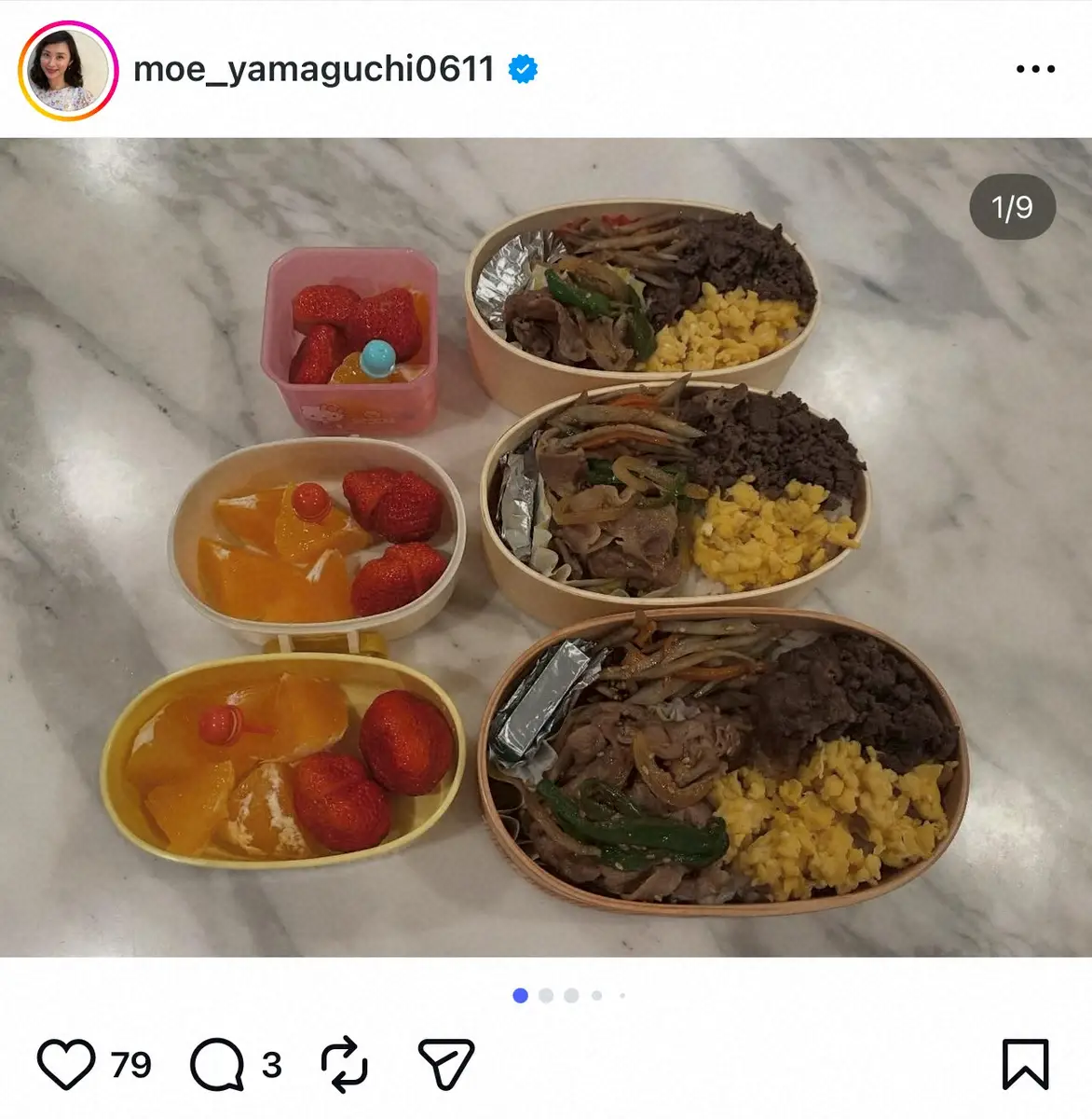 山口は「毎朝5時お弁当3個生活が突然終わった 長女から“明日でお弁当最後”と突然言われたのだ!!」とし3つのお弁当の写真をアップ。「長女の大好きなものでお弁当箱をいっぱいにしてあげたかったけど前の晩に突然言われたのでいつもの通りのいつもな弁当になった」とつづった。