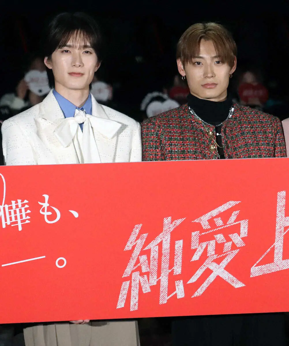M!LKの山中柔太朗(24)と超特急の髙松アロハ(25)が26日、都内でダブル主演映画「純愛上等!」(監督八重樫風雅、2月13日公開)の完成披露上映会に出席した。