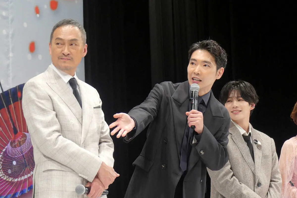 映画の舞台あいさつに出席した(左から)渡辺謙、柄本佑ら