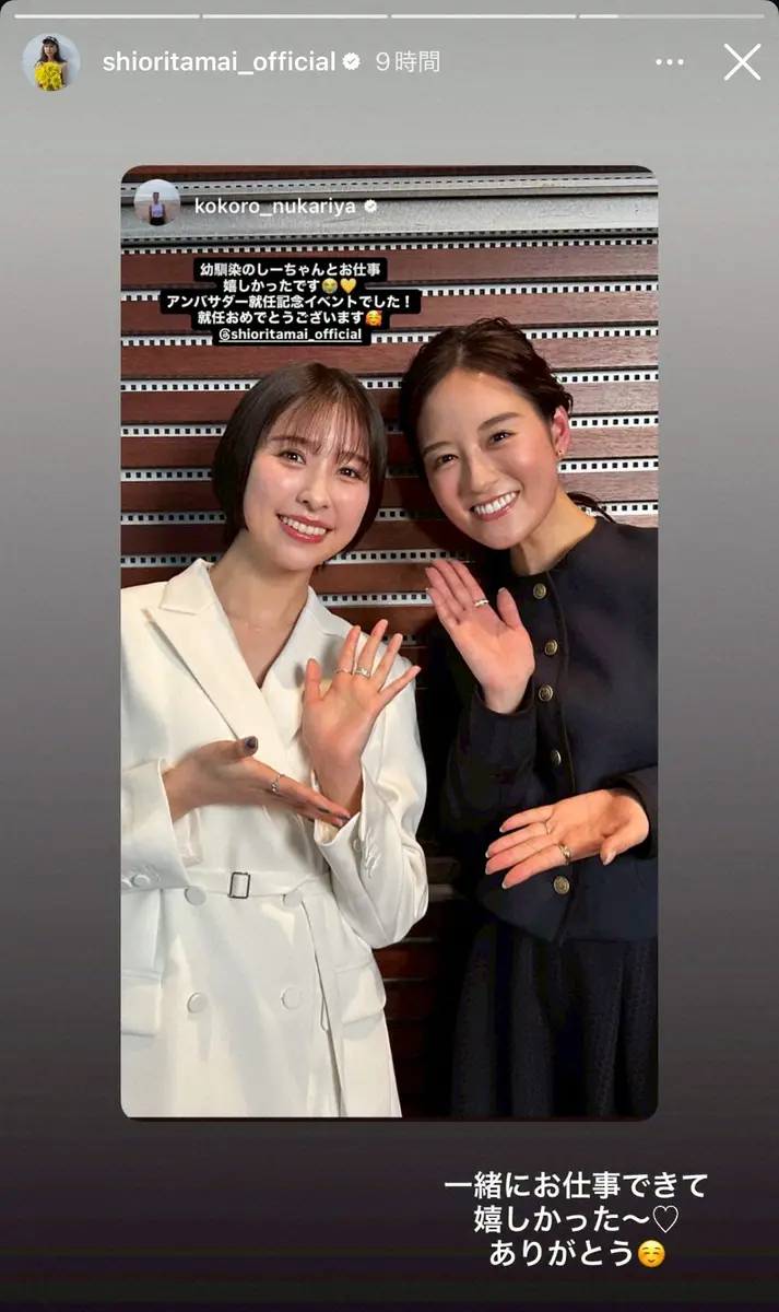 実は2人は幼馴染で初共演。イベント終了後、忽滑谷アナは自身のインスタグラムのストーリーズで「幼なじみのしーちゃんとお仕事嬉しかったです」とし笑顔の2ショットをアップした。