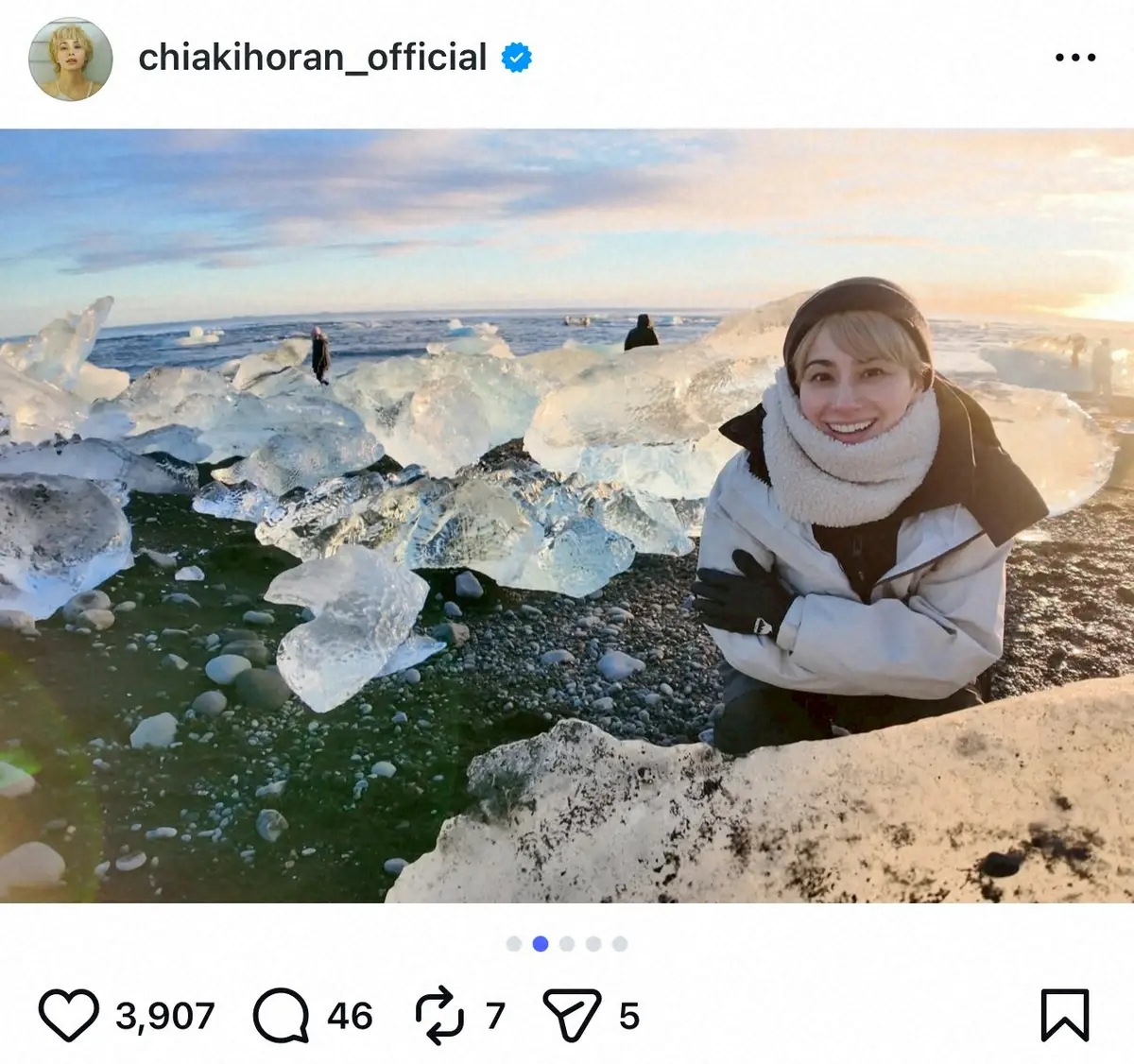 続く投稿では氷河から流れ着いた氷が見られる名所・ダイヤモンドビーチでのショットを披露。浜辺にはゴロゴロと大きな氷のかけらが見られ、太陽に照らされ輝いている。「氷河のかけらが宝石以上に輝いて見えた!」と絶景に息をのんだ。