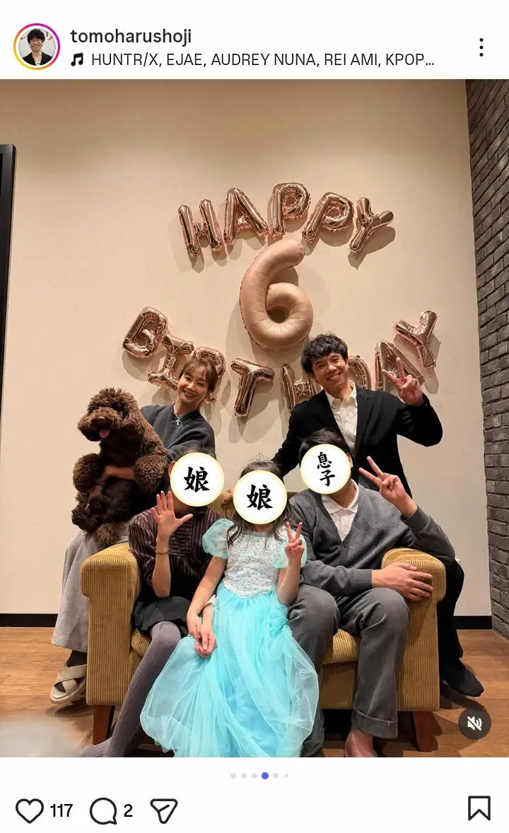 お笑いコンビ「品川庄司」の庄司智春(50)が27日、自身のインスタグラムを更新。次女が6歳誕生日を迎えたことを報告し、家族ショットを披露した。