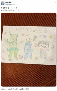 この投稿に「かわいすぎてほっこり」「スイちゃんめっちゃ絵上手やな…」「コッシーのお友達の高橋茂雄さん、おめでとうございます」などの声が上がった。