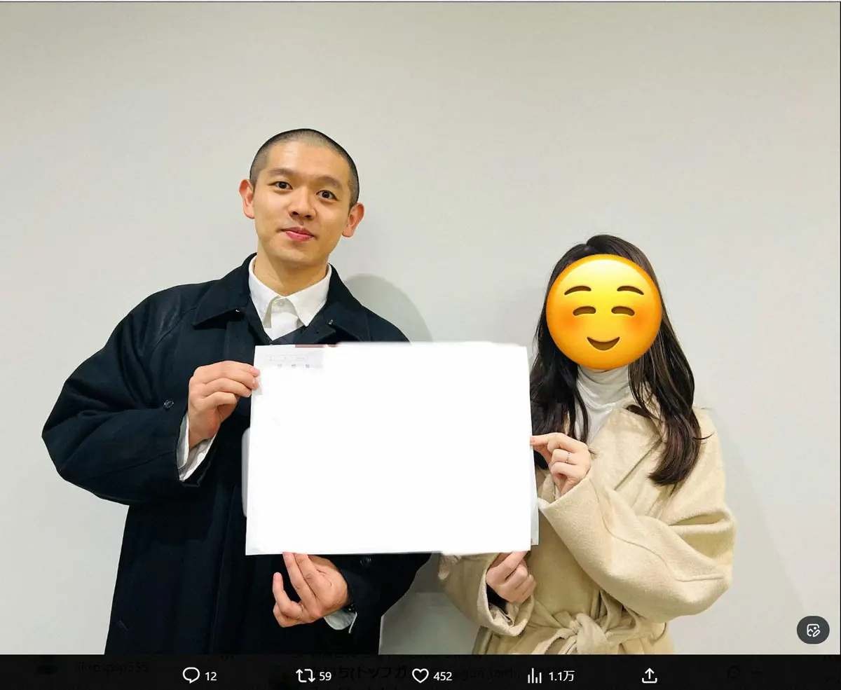「私事で大変恐縮ですが、有り難いご縁とお導きによりお付き合いしている方と入籍いたしました」と報告。婚姻届を手にした妻とのツーショットを公開した。