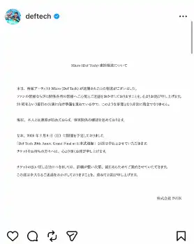所属事務所の株式会社2VOXがグループの公式サイトやSNSで「Micro (Def Tech)逮捕報道について」と題した声明を発表。「本日、所属アーティストMicro (Def Tech)が逮捕されたとの報道がございました」と伝え、「ファンの皆様ならびに関係各所の皆様へご心配とご迷惑をおかけしておりますことを、心よりお詫び申し上げます。20周年という節目の公演に向け準備を重ねている中で、このような事態となり非常に残念でなりません」と謝罪した。