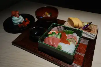 昼食は藤井が「梅山豚炭火焼カツ」、永瀬が「海鮮重」「立川苺(いちご)のショートケーキプリンアラモード」を頼んだ。