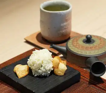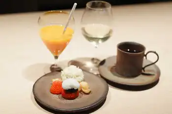 茶わん蒸しなどに使われるイメージがある百合根だが、和菓子として提供された。糖度が高い北海道産「月光百合根」を使用。収穫後、低温高湿度で食材を保存する「雪室」に2カ月間貯蔵し、さらに甘みが引き立ったこだわりの百合根。大納言小豆の風味も合わさり、優しい味わいで両者を癒やした。