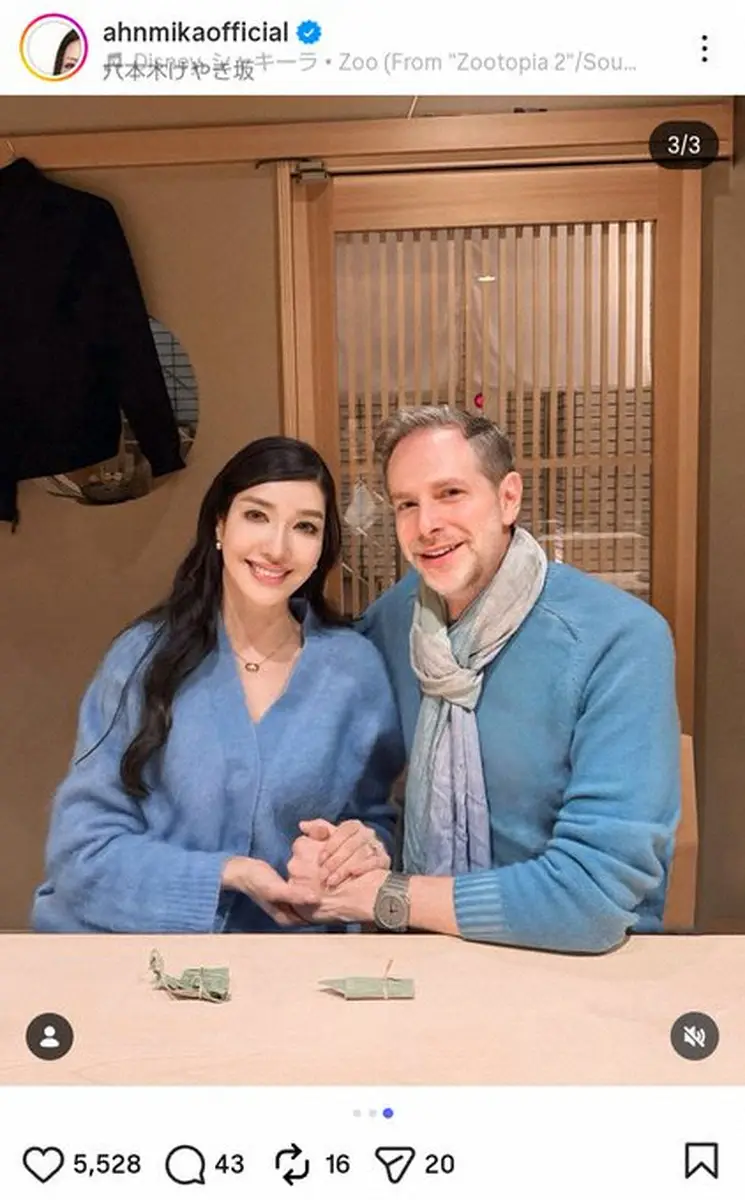 「Happy Valentine's Day」と書き出したアンミカ。「旦那様の @theodoremillertokyo と、やっと見たかった映画【ズートピア2】が観れた」とつづって、夫のセオドール・ミラー氏との2ショットをアップした。
