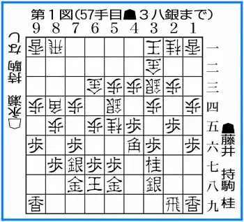 角換わり腰掛け銀へ進んだ、永瀬の56手目△5五桂への応手▲3八銀(第1図)。当たりになった銀を上下どちらへ逃がすかの2択で藤井は退却させた。