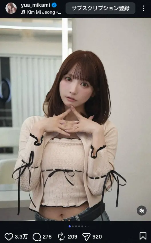SKE48の元メンバーでタレントの三上悠亜(32)が27日までに自身のインスタグラムを更新。久々ボブ・ヘアでの“おへそチラリ”ショットを披露した。