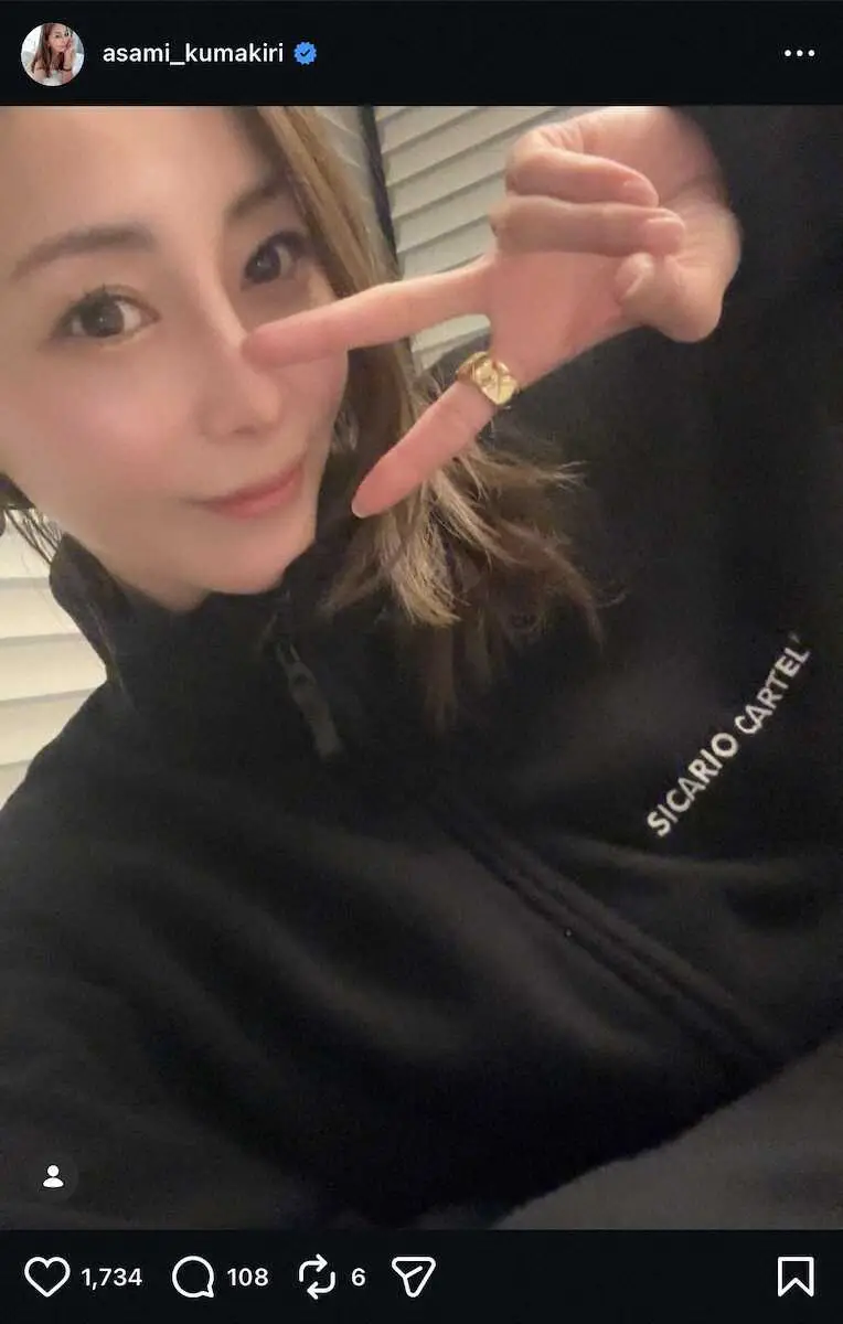 タレントの熊切あさ美(45)が2日までに自身のインスタグラムを更新。スウェット姿でのピースサイン自撮りショットを投稿した。