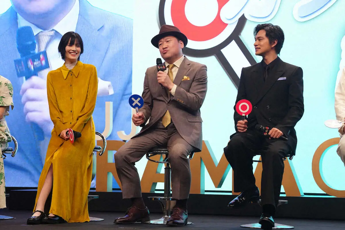 <FUJI DRAMA COLORS 2026 SPRING>○×カラーズ診断をする(左から)橋本愛、佐藤二朗、北村匠海(撮影・大城 有生希)