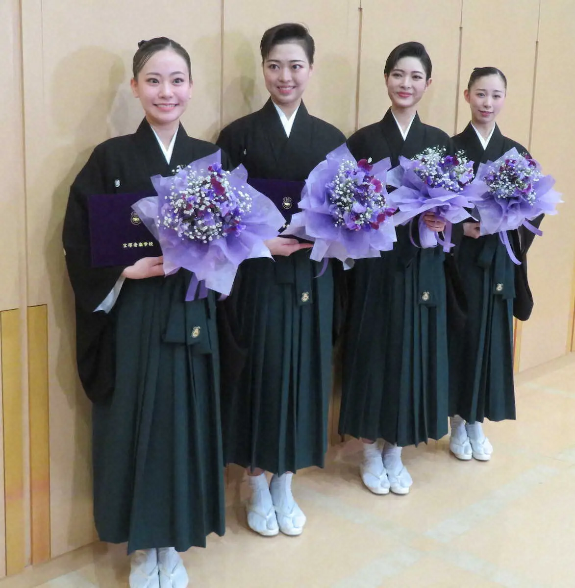 卒業式後、囲み取材に応じる宝塚音楽学校112期生の成績上位者。左から首席の國宗美花さん、赤井七海さん、小寺環菜さん、吉田今日花さん