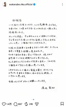 「20歳から芸能界でお仕事をさせていただく中で、たくさんの出会いや貴重な経験に恵まれました。その中で自分が本当に安心できるのは、穏やかで自然体でいられる時間だと気づきました。そんな自分らしさを大切にできる方と出会い、このようなご報告ができることを嬉しく思っています」と続け、「これからは二人で温かい家庭を築き、ポジティブなエネルギーを自分の活動に活かせるよう頑張っていきたいと思います。今後ともどうぞよろしくお願いいたします。渡辺梨加」と締めくくった。