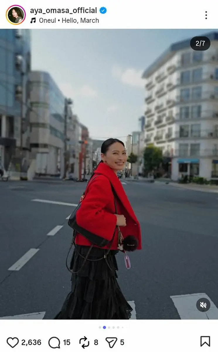 「#今日の絢服」と書き出し、「赤い服はあまり持っていないけれど、無性に袖を通したくなる日がある」と紹介。赤いジャケットが目を引くコーディネートを披露した。