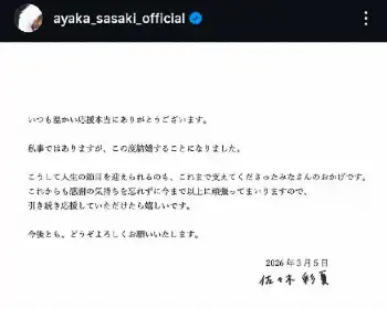 佐々木彩夏の公式インスタグラム(@ayaka_sasaki_official)から ももクロ佐々木彩夏 最強開運日に電撃結婚発表 30歳を前に お相手は一… ギャラリーで見る この記事のフォト 2026年03月05日の画像一覧 もっと見る 2026年03月05日の画像をもっと見る