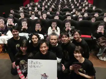 作品は、どこまでがリアルで、どこからが虚構か、観る者を巻き込んでいく新感覚のミステリー。「撮休がないから来られない?」と舞台あいさつ予定のメンバーから名前が外れていた津田だったが、突然の来場にファンは驚くやら感激するやら。そんな中、登壇した津田は「(主人公は)無意識に人を傷つけてしまったり…ほぼほぼ僕自身でした」とあいさつ。そして「満席で、初日がこわいです」と話し、配布された「津田寛治お面」をつけた観客とともに笑顔で写真撮影に臨んだ。