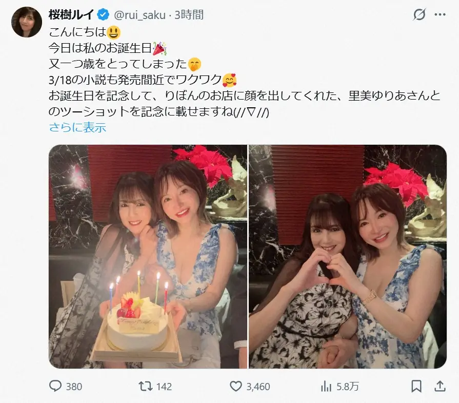 桜樹ルイ 57歳の誕生日に近影公開し「里美ゆりあさんとのツーショットを記念に載せますね」
