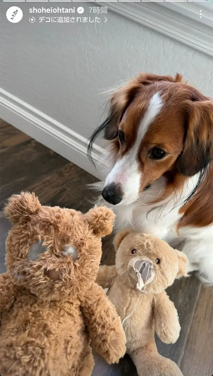 大谷はまず、目や鼻が取れたクマのぬいぐるみの写真を投稿。次に鼻が取れボロボロになったぬいぐるみと、申し訳なさそうな表情にも見えるデコピンの姿を披露した。