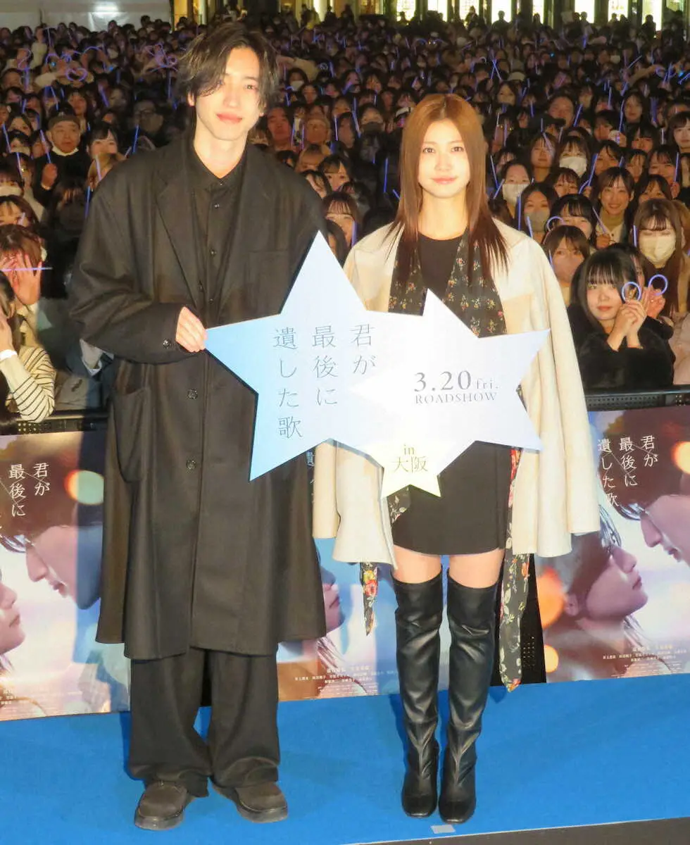 なにわ男子の道枝駿佑(23)が11日、地元・大阪のうめきた広場で“めるる”こと生見愛瑠(24)と映画「君が最後に遺した歌」(20日公開、監督三木孝浩)のトークショーを行った。