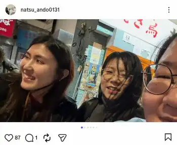 安藤は複数の写真で近況を報告。「緊張感ある仕事終えたあとの東京タワーはすごく綺麗に見えたので飲みに行ったりタコパ(定期)したり」と、「納言」薄幸、「相席スタート」山﨑ケイとの写真を披露した。