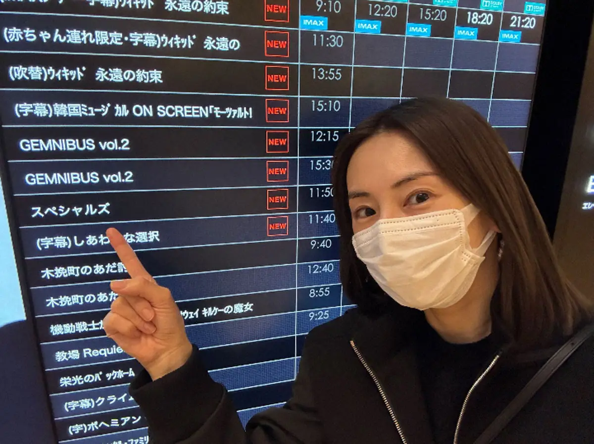 添えられた写真は、マスク姿で映画館内の上映リストを指さすもの。「なぜこんな写真かというとポスターが見当たらず、チケットは最近流行りの?ピッだったので、紙がない。パンフレットもグッズも人気で全て完売とのこと。買いたかった」と理由を説明しつつ、グッズが手に入らなかったことを嘆いた。