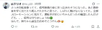 「さっき自転車乗ってて、信号無視の車に突っ込まれそうになった。あと数秒家を早く出てたら死んでたかもと思うと、しばらく動けなくなってた」と告白し、「全部スローモーションに見えて、運転手がおじいちゃんだったの確認したんだけども、、、信号は守りましょうね」とつづった。