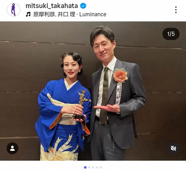 「国宝」で優秀助演女優賞を受賞した高畑は、着物姿での李相日監督との2ショットや「国宝」チーム、「秒速5センチメートル」チームとの集合ショットなどを投稿。「李監督とは『怒り』で出会って国宝に繋がり、作品賞の素晴らしい景色をみせていただきました。奥山監督とはカメラマンと被写体として出会って秒速5センチメートルの世界に飛び込む切符をいただきました」とそれぞれの作品との関わりに触れ、「そう思うと、目の前の(いま)がひとつひとつ積み重なって、数年後に目の当たりにする景色に繋がるのだな、と。一瞬とて意味のない時間は無いのだな、と思い知らされました。これは、ぼーっとしていられないな、と」と思いをつづった。