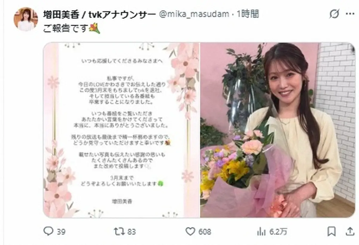 Xへの投稿では「私事ですが、今日のLOVEかわさきでお伝えした通り この度3月末をもちましてtvkを退社、そして担当している各番組も卒業することになりました」と報告。「いつも番組をご覧いただき あたたかい言葉をかけてくださって 本当に、本当にありがとうございました」と感謝した。