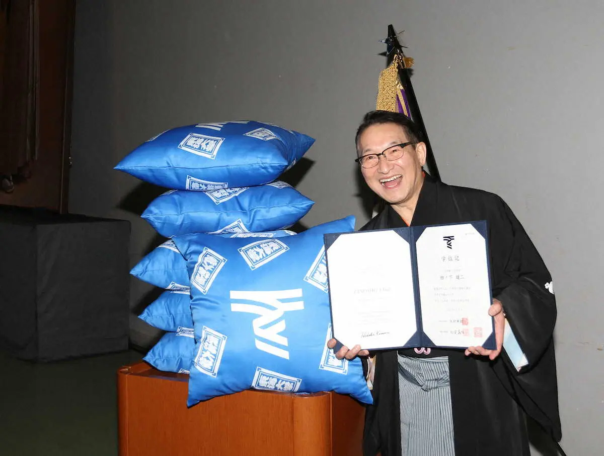 落語家の春風亭昇太(66)が25日、神奈川県平塚市の東海大湘南キャンパスで学位授与式に臨んだ。妻が見守る中、特別賞を受賞。サプライズで東海大カラーの特製座布団10枚が贈呈された。謝辞のスピーチでは「卒業生、保護者の皆さんに座布団10枚!!」と日本テレビ「笑点」の司会らしく会場を沸かせた。