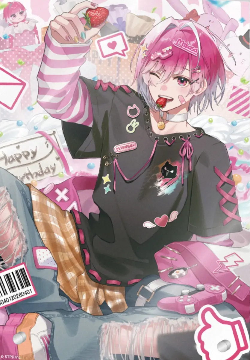 今回のために描き下ろされた新ビジュアルは、みかさくんがバースデーケーキの上にちょこんと座り、色とりどりのプレゼントに囲まれたシチュエーション。思わずドキッとする「あーん」のポーズや、さりげなく添えられたゲームのコントローラーなど、みかさくんらしさが満載のイラストとなった。3月31日夜から日付が変わり誕生日を迎える瞬間をカウントダウン生配信をして「一生分のおめでとうください」と、ほんの少し甘えた。