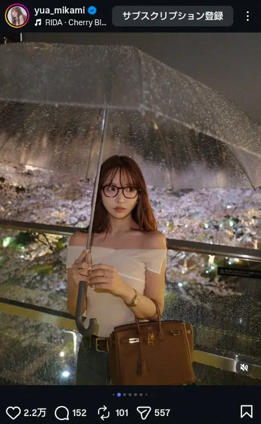 SKE48の元メンバーでタレントの三上悠亜(32)が8日までに自身のインスタグラムを更新。オフショルニット姿の夜桜ショットを公開した。