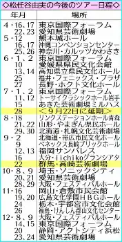 一方で、大手イベンター関係者は「プロ意識の高さからコンサートを延期して手術を受けることにかなり悩んだと聞いた。1年以上にわたるツアーの中で、極力影響の出ない日程で手術を受けることにしたようだ」と説明。7月28日の公演を中止すれば、同15日から翌月18日まで1カ月以上空くため、1公演延期で済む治療スケジュールを探ったとみられる。復帰後も12月までせわしなく全国を飛び回る日程を“プロ根性”で乗り越える。