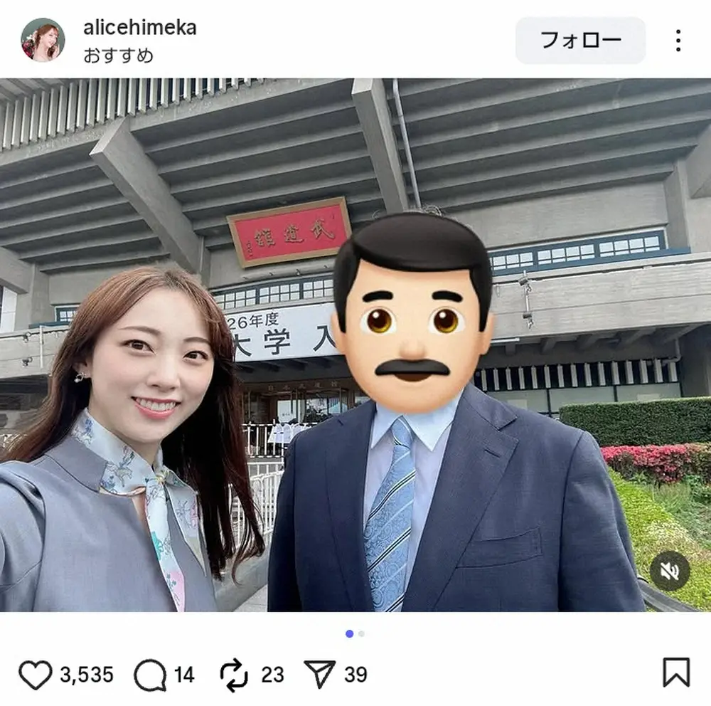 2024年に宝塚歌劇団の雪組を退団した有栖妃華が15日、自身のインスタグラムを更新。家族が大学へ入学したことを伝えた。