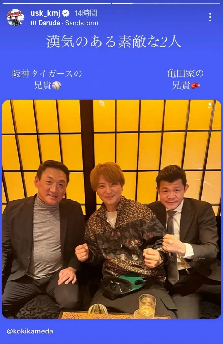 ストーリーに自身と元阪神監督の金本知憲氏、プロボクシング元世界3階級制覇王者の亀田興毅氏との3ショットをアップ。
