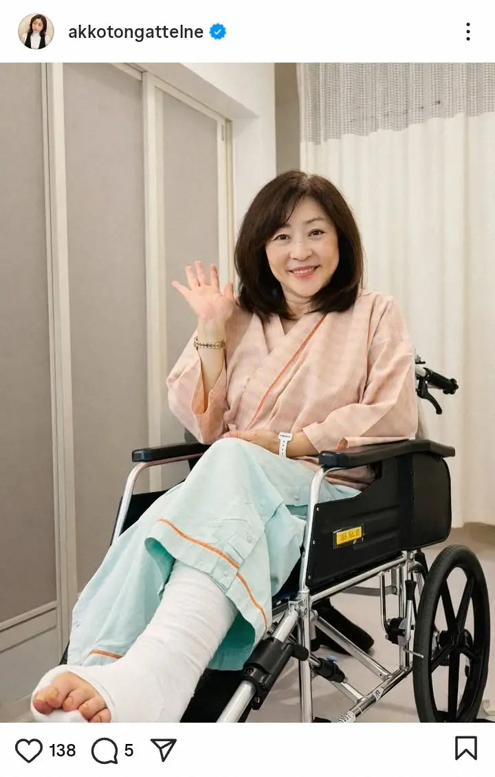 「医師より許可をいただき、当初の予定より早く、19日に退院できることになりました」と報告し、車椅子姿の最新ショットを披露。