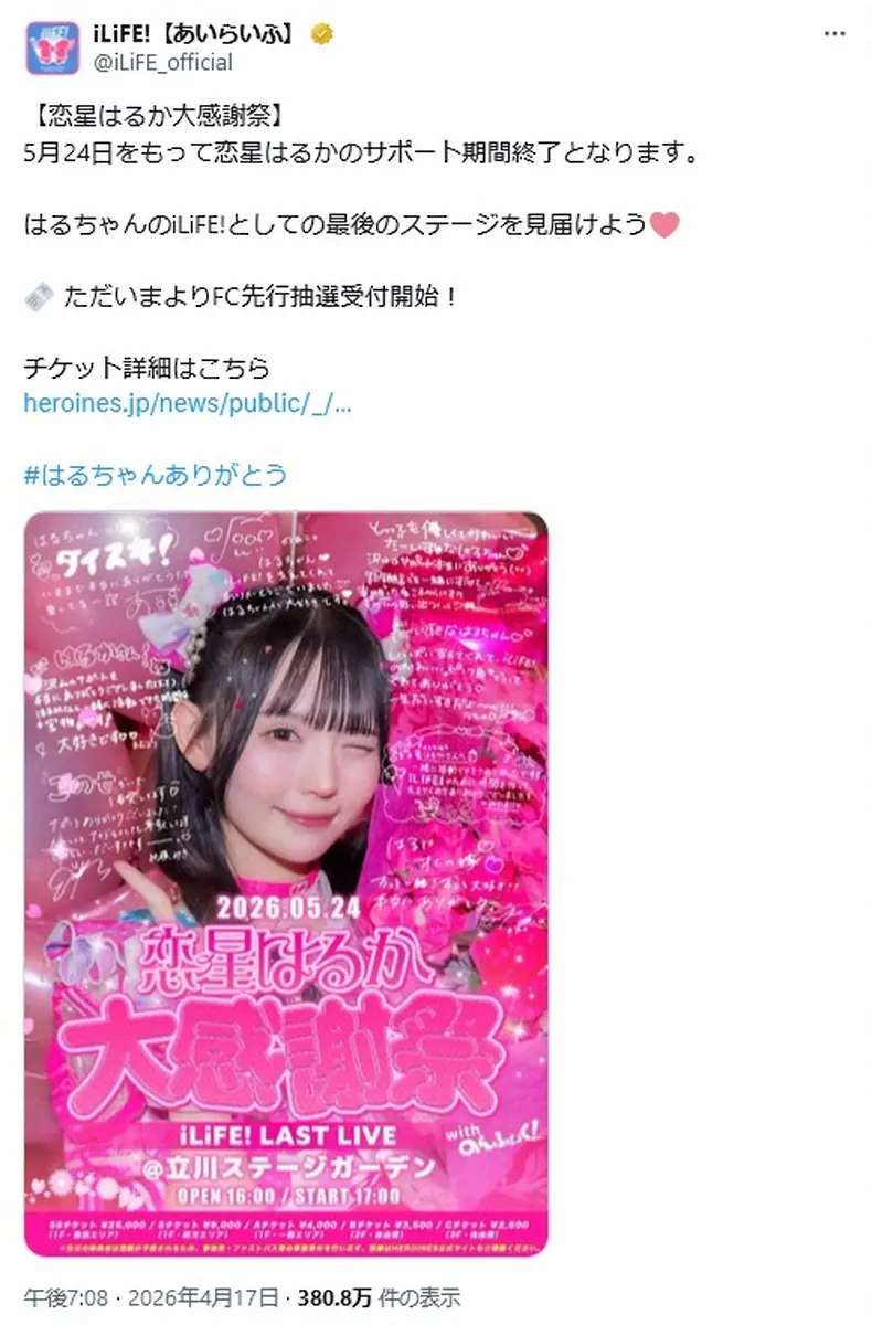 【画像・写真】iLiFE!恋星はるかの活動終了をお知らせ メンバーからも「沢山のサポート本当にありがとう」