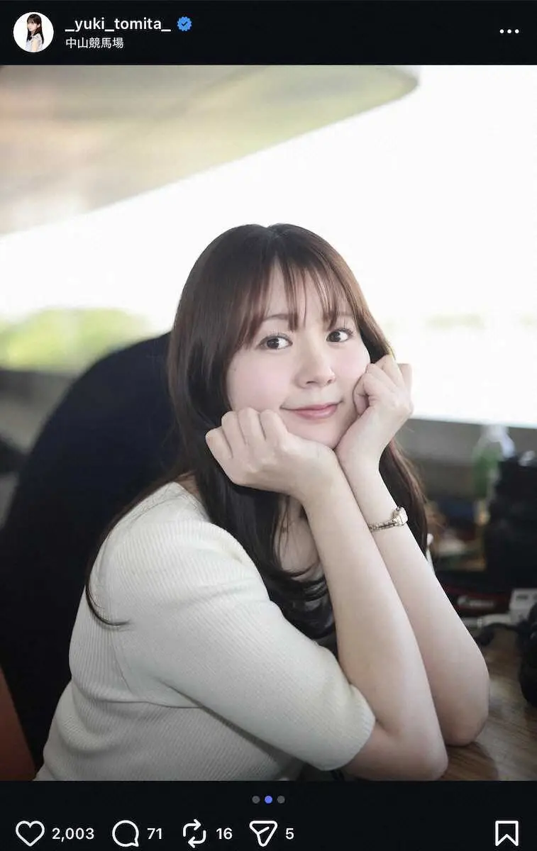 テレビ東京「ウイニング競馬」にレギュラー出演している同局の冨田有紀アナウンサー(27)が、19日までに自身のインスタグラムを更新。白半袖ニットの“あざと”ポーズショットを投稿した。