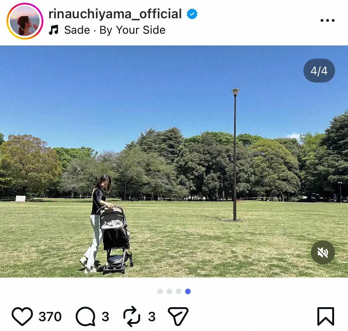 内山は「新緑に包まれながら、深呼吸して、歩いて、喋ってリフレッシュした時間」と書き出し、緑豊かな風景の写真や、ベビーカーを押す自身の写真を投稿。