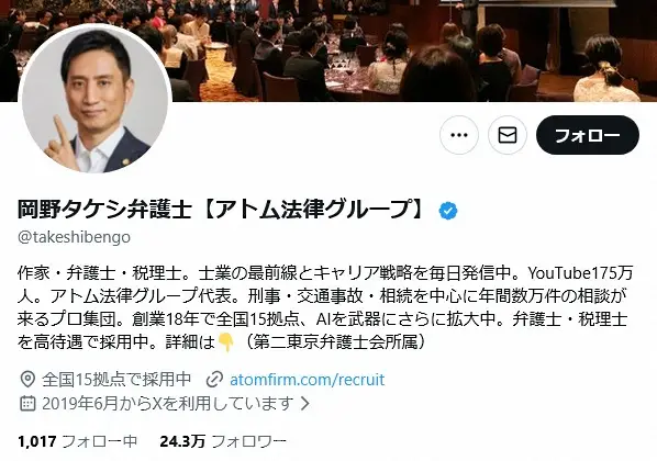 チャンネル登録者数176万人を超える「アトム法律グループ」代表の弁護士・岡野タケシ氏が19日までに自身のYouTubeチャンネルを更新し、京都府南丹市の事件について言及した。