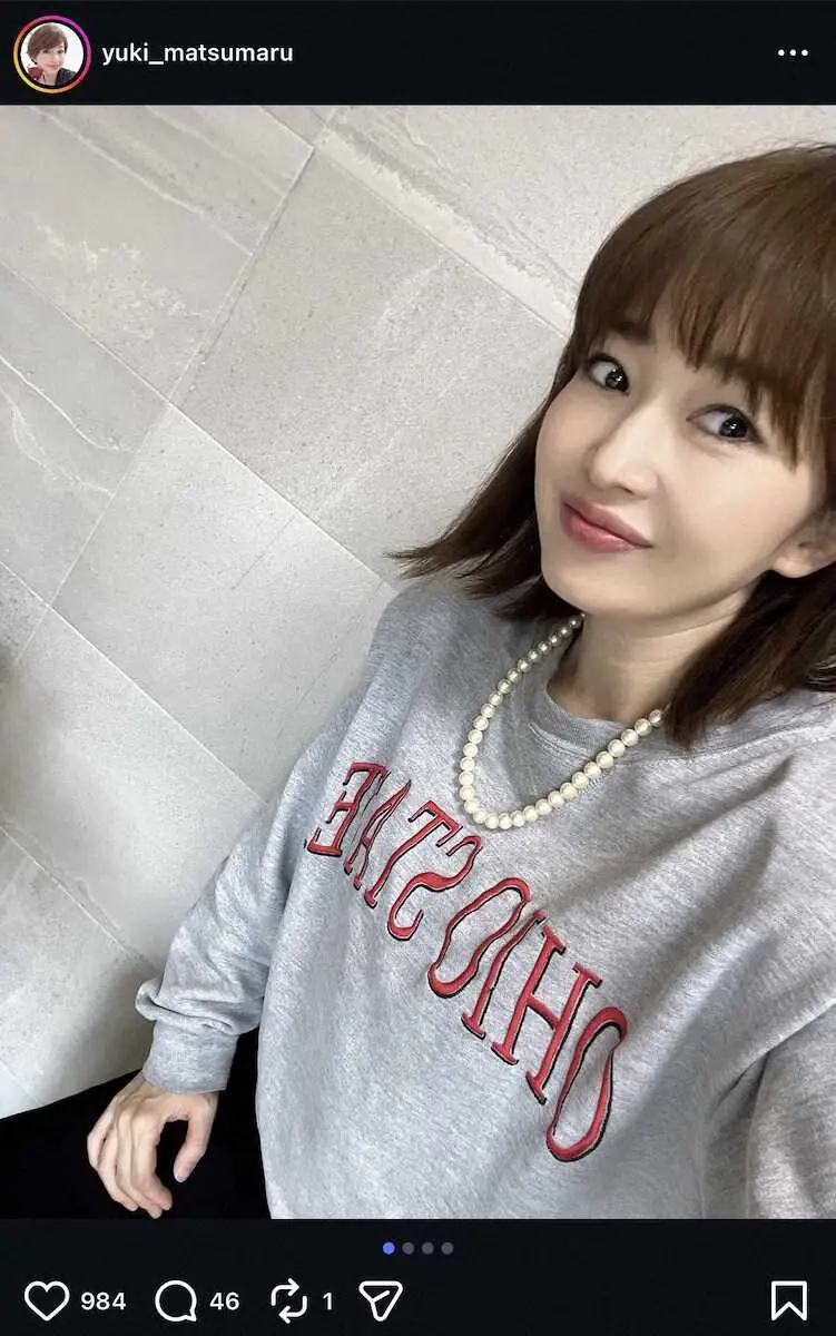 フリーアナウンサーの松丸友紀(44)が19日までに自身のインスタグラムを更新。人生初の古着ショットを報告した。