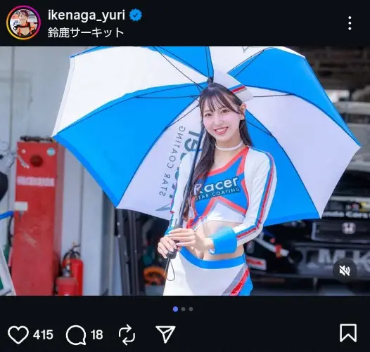 人気レースクイーンの池永百合(30)が20日までに自身のインスタグラムを更新。白に青&赤ラインのコスチューム姿で表彰台を報告した。
