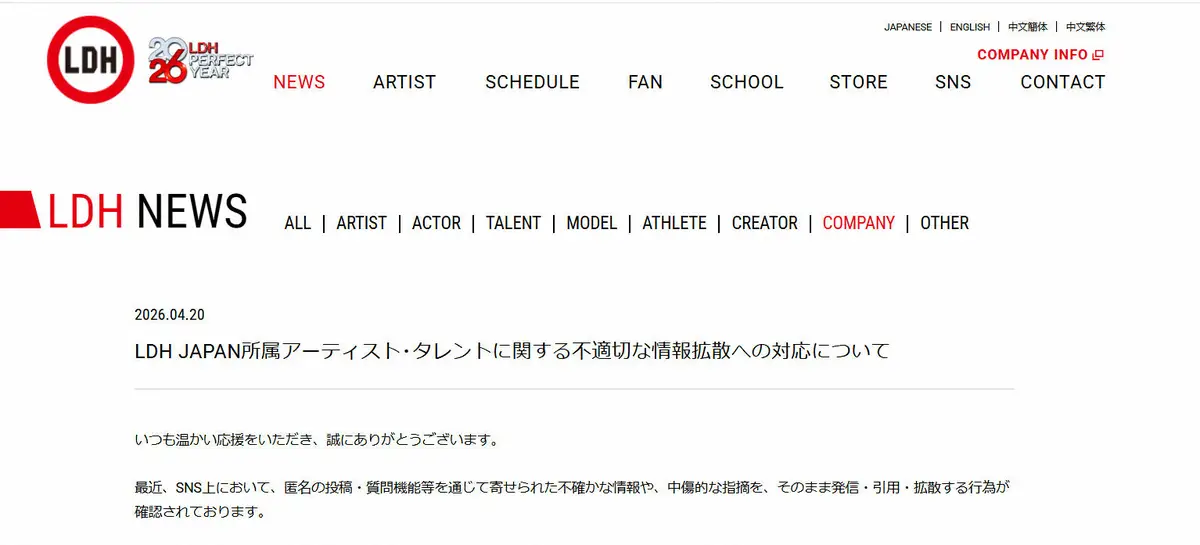 LDHは20日、公式サイトを更新し。所属するアーティスト・タレントに関する不適切な情報拡散への対応について注意喚起した。