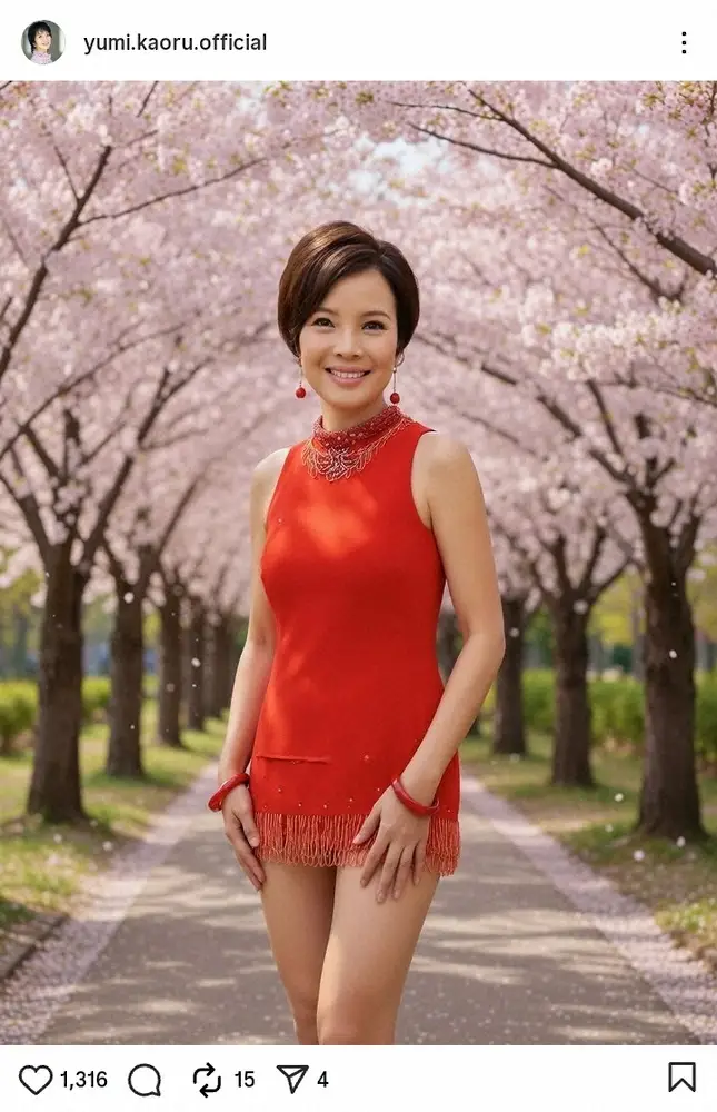 しかし「AIが作成した20歳の由美かおるです、、、」とネタばらし。「デビュー当時の面影が、、、(笑)」と自虐気味にツッコんだものの、「スリーサイズは維持できています!」と報告した。