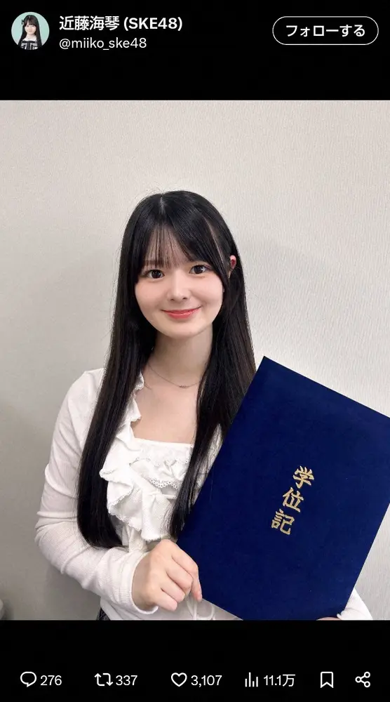 SKE48のチームKllに所属する近藤海琴(22)が21日までに自身のインスタグラムを更新し、大学卒業と小学校教員・幼稚園教諭免許取得を報告した。