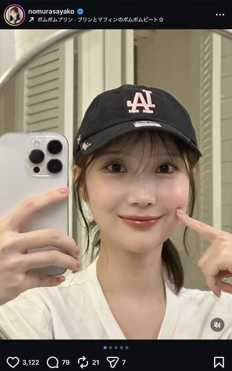 TBSの野村彩也子アナウンサー(28)が22日までに自身のインスタグラムを更新。LAキャップを着用した自撮りショットを投稿した。